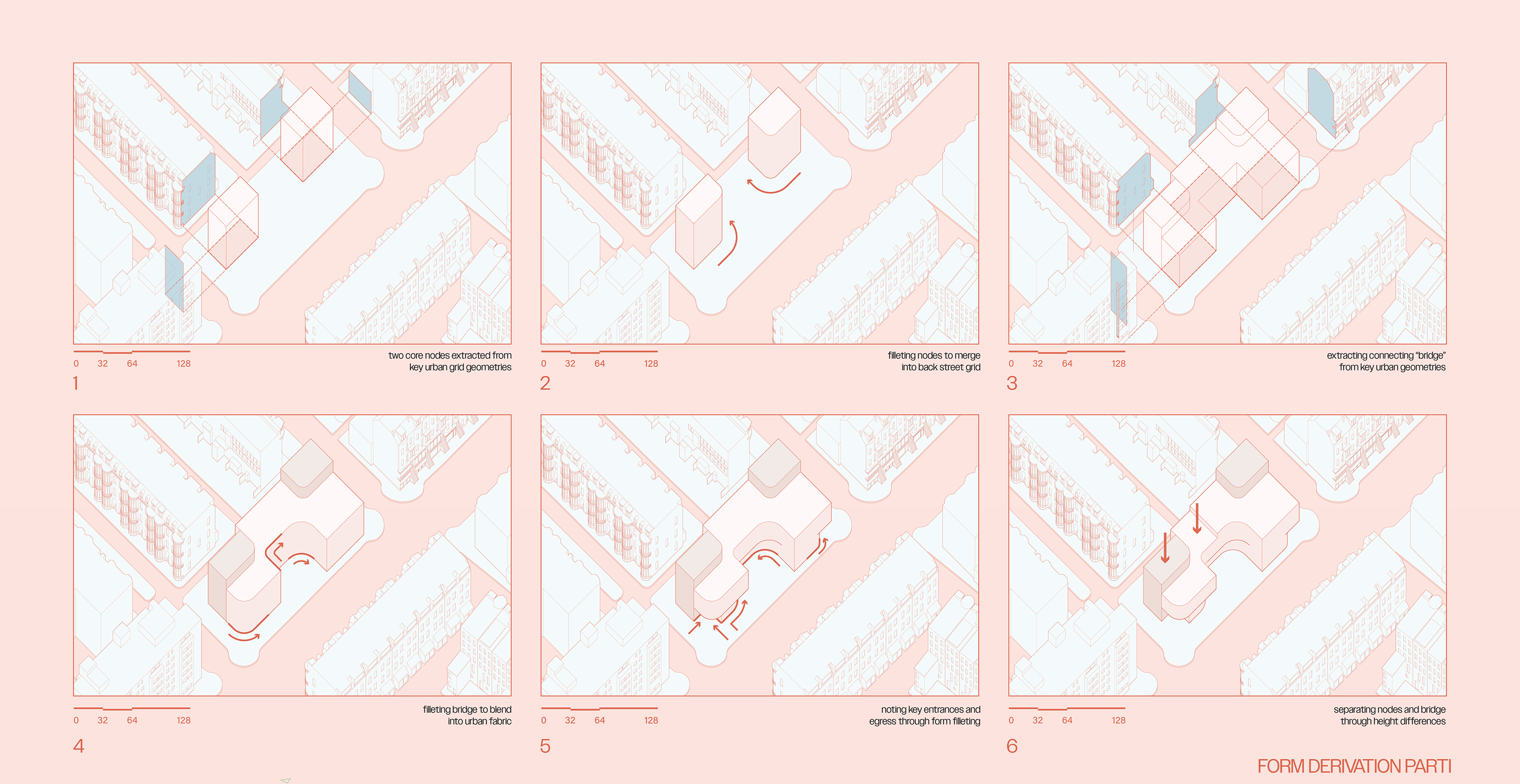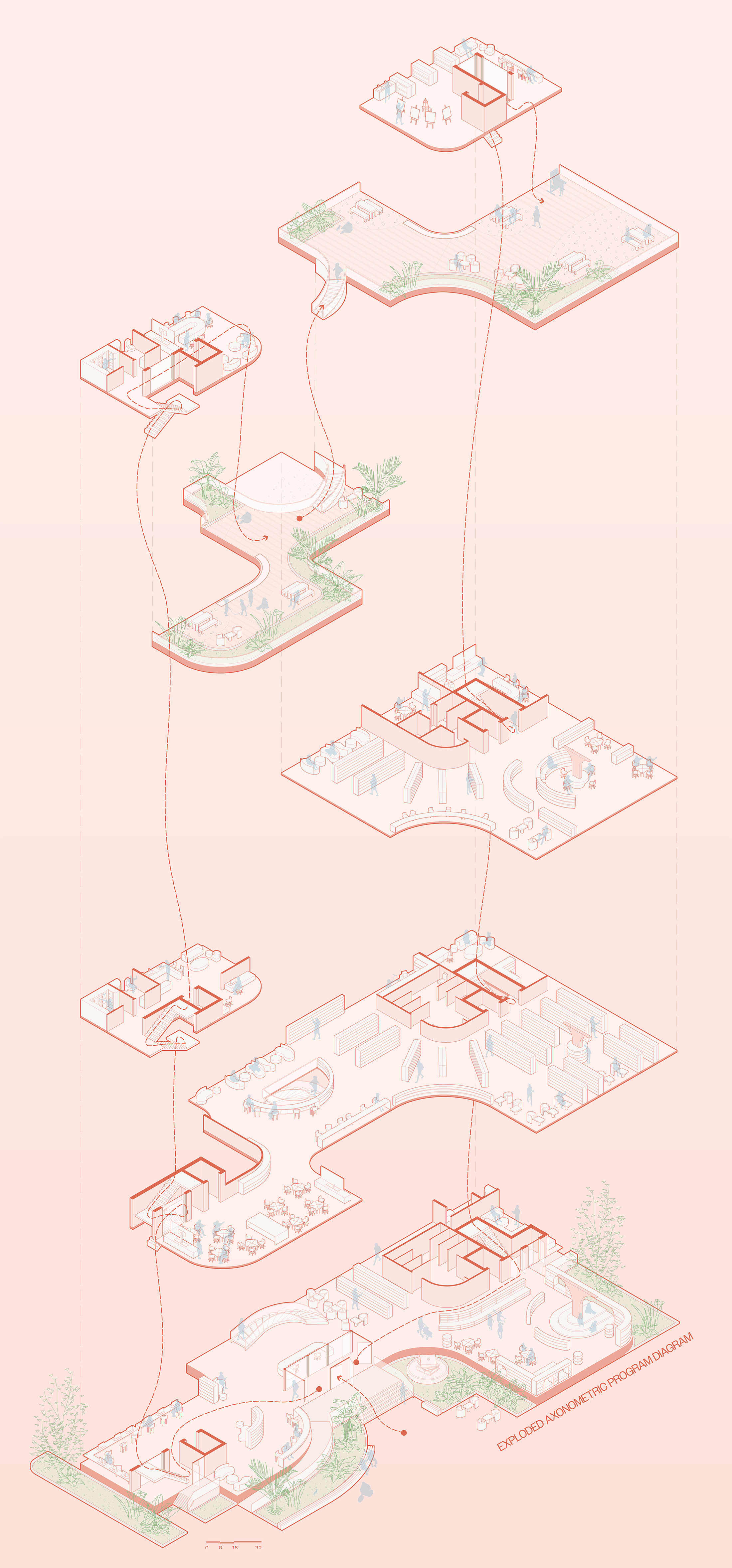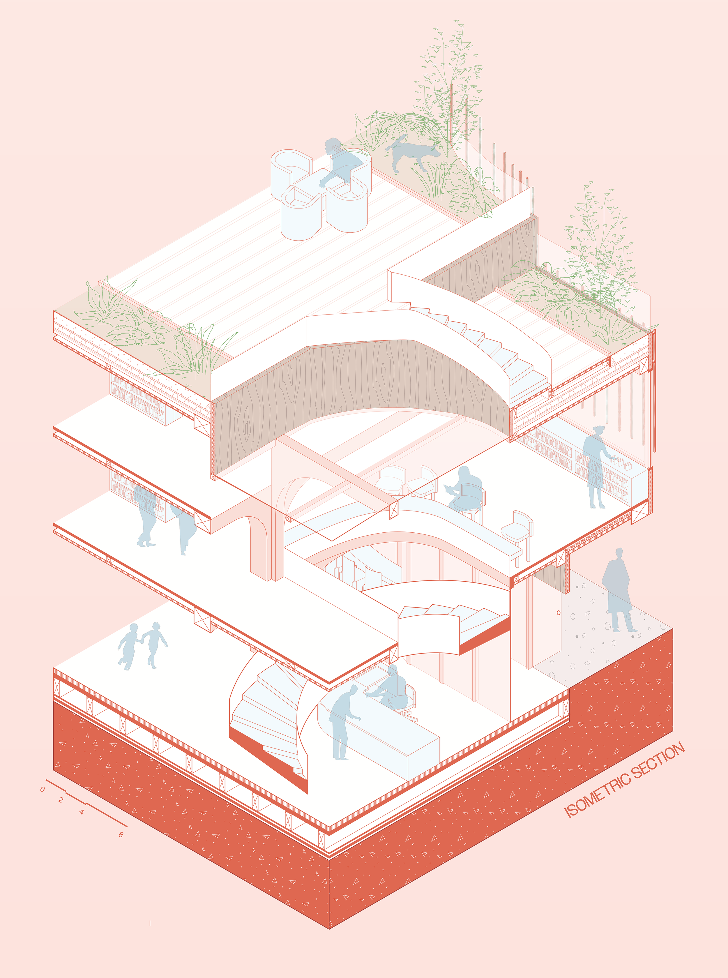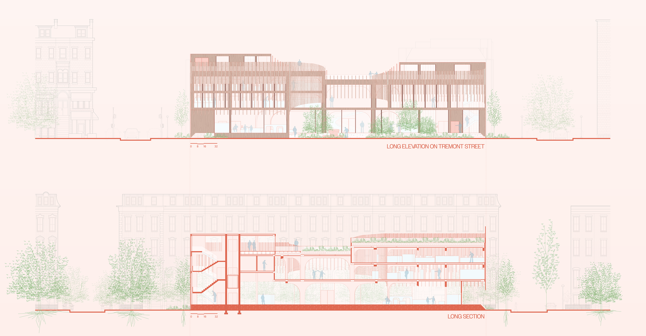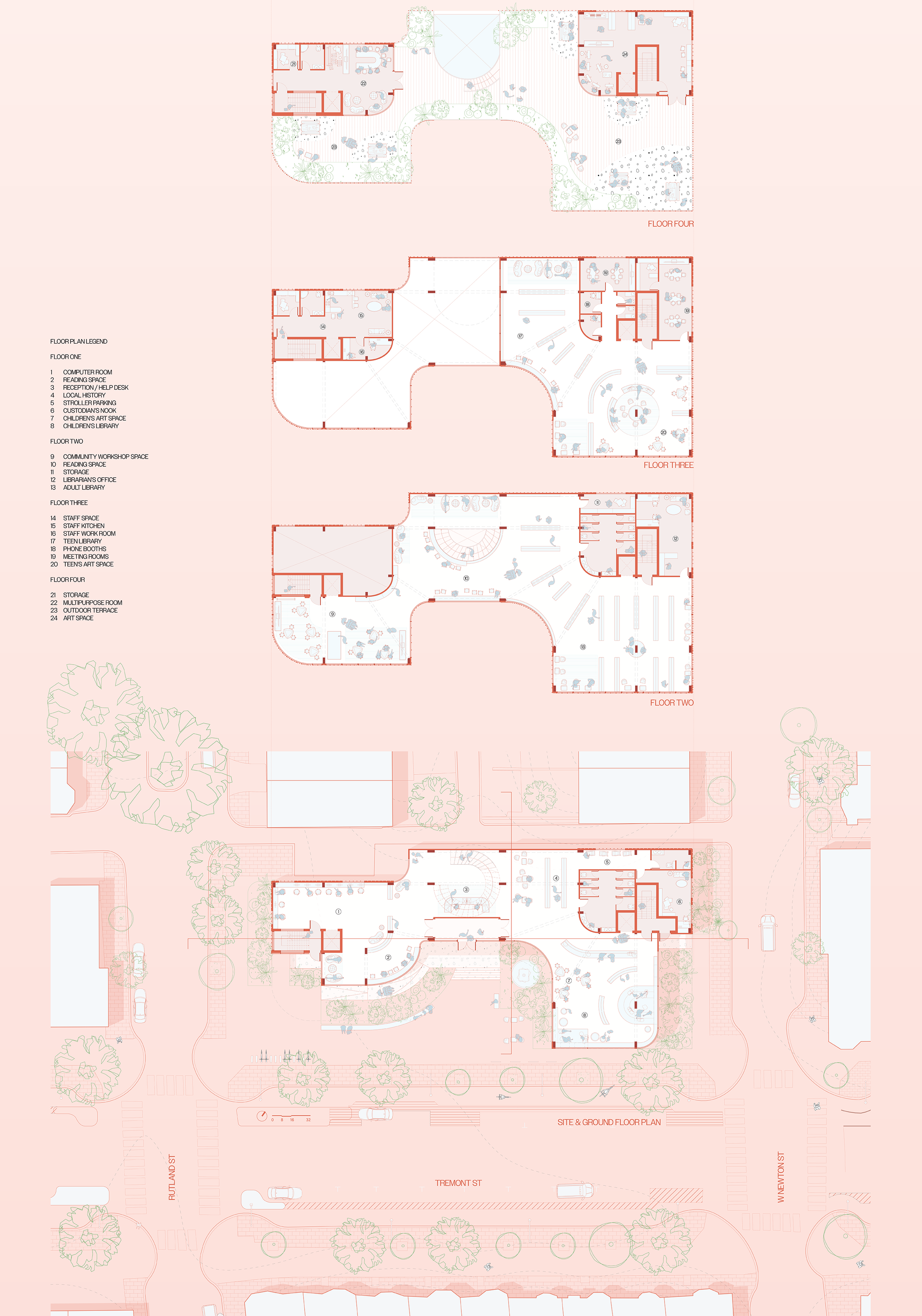 The Tremont St. Library emerges from the massings of nearby buildings, deriving key surrounding volumes to generate spaces that address local needs. The design is structured around two key volumes – a “community node” and a “library node” – that are bridged together by a conceptual “third node,” defined by a central experiential staircase and the main entrance. Half-floor offsets create layered relationships between spaces, allowing for selective visibility and privacy across different programs.