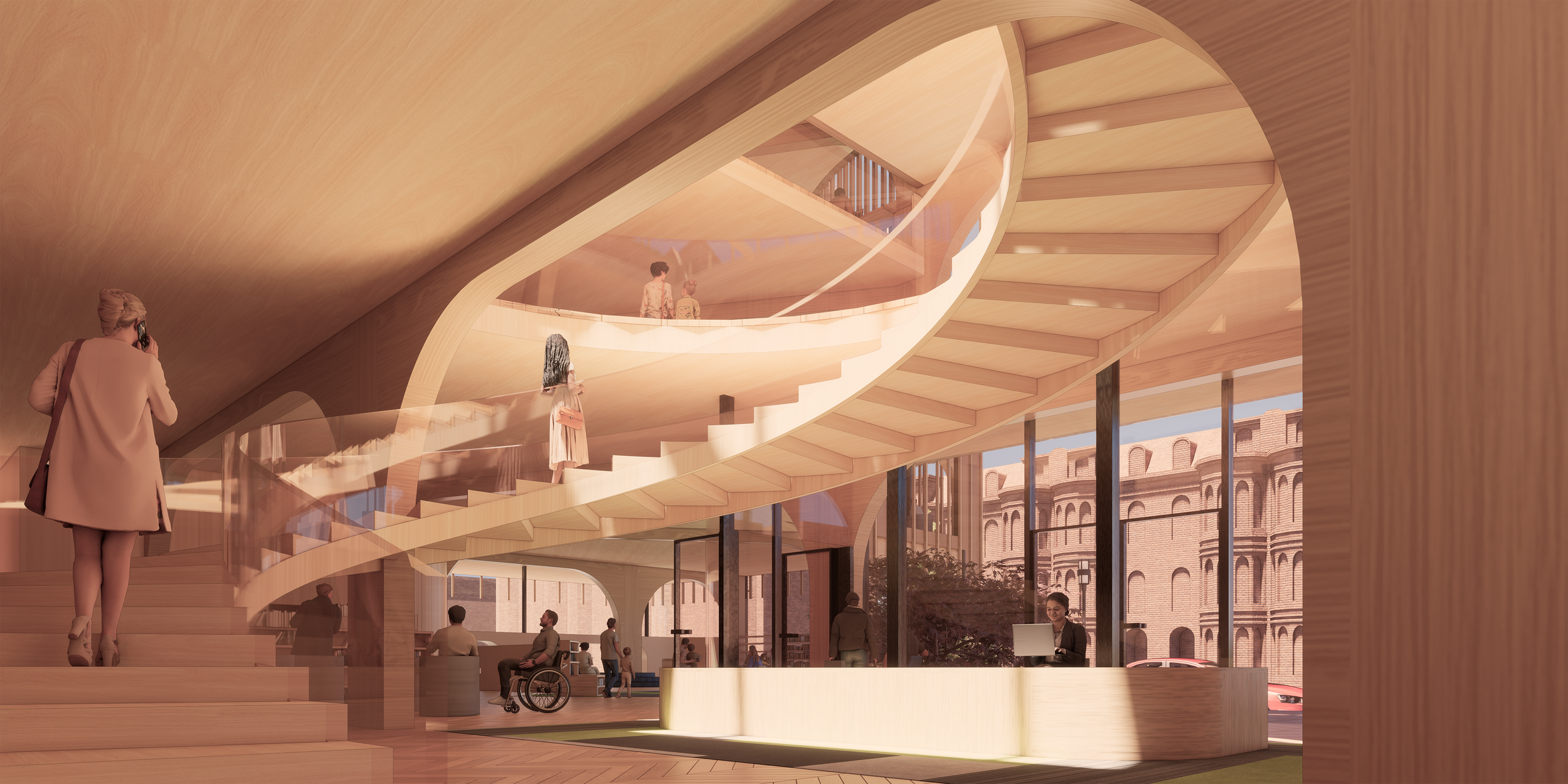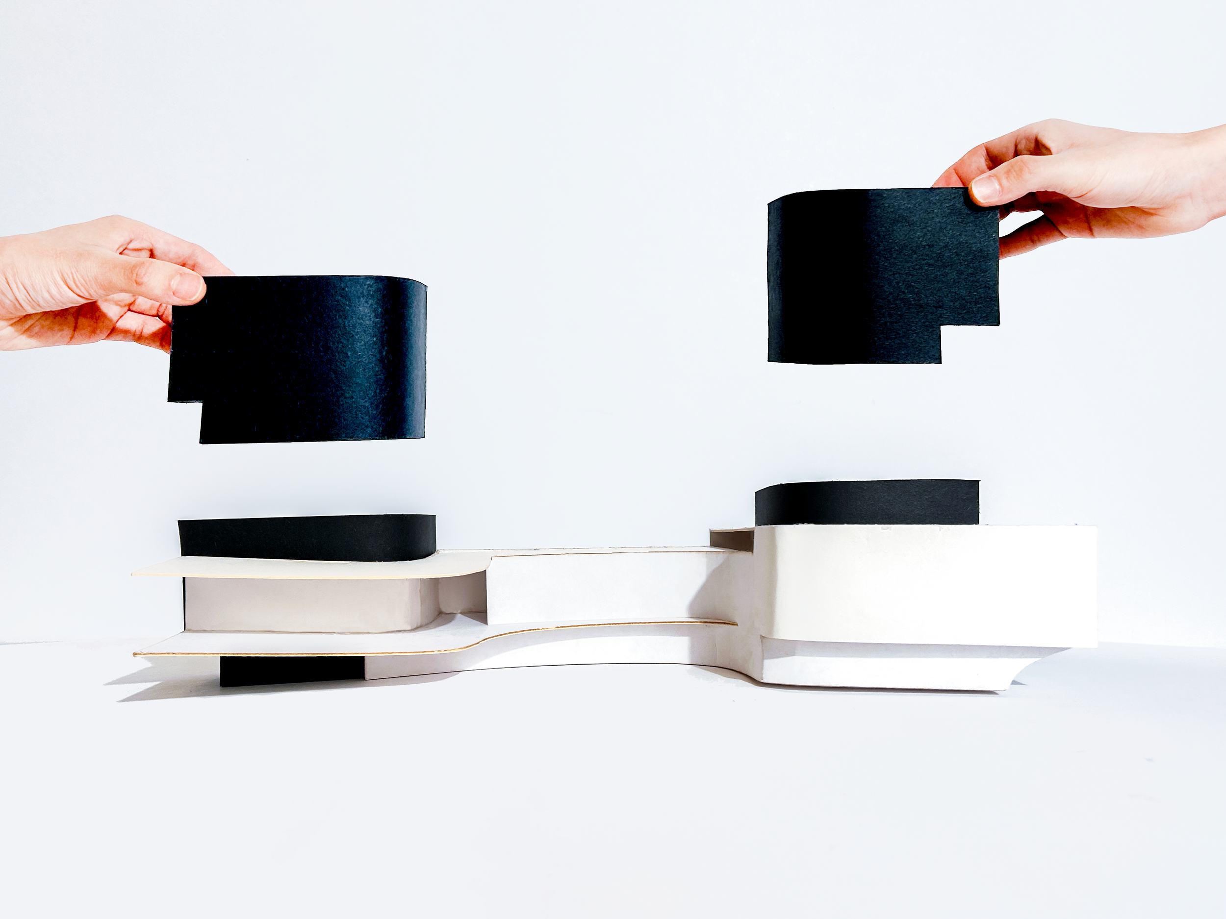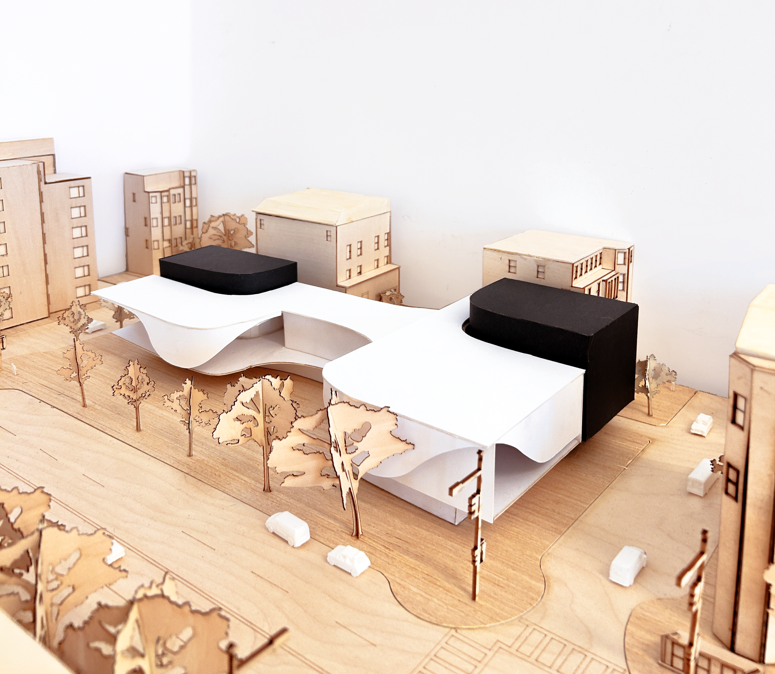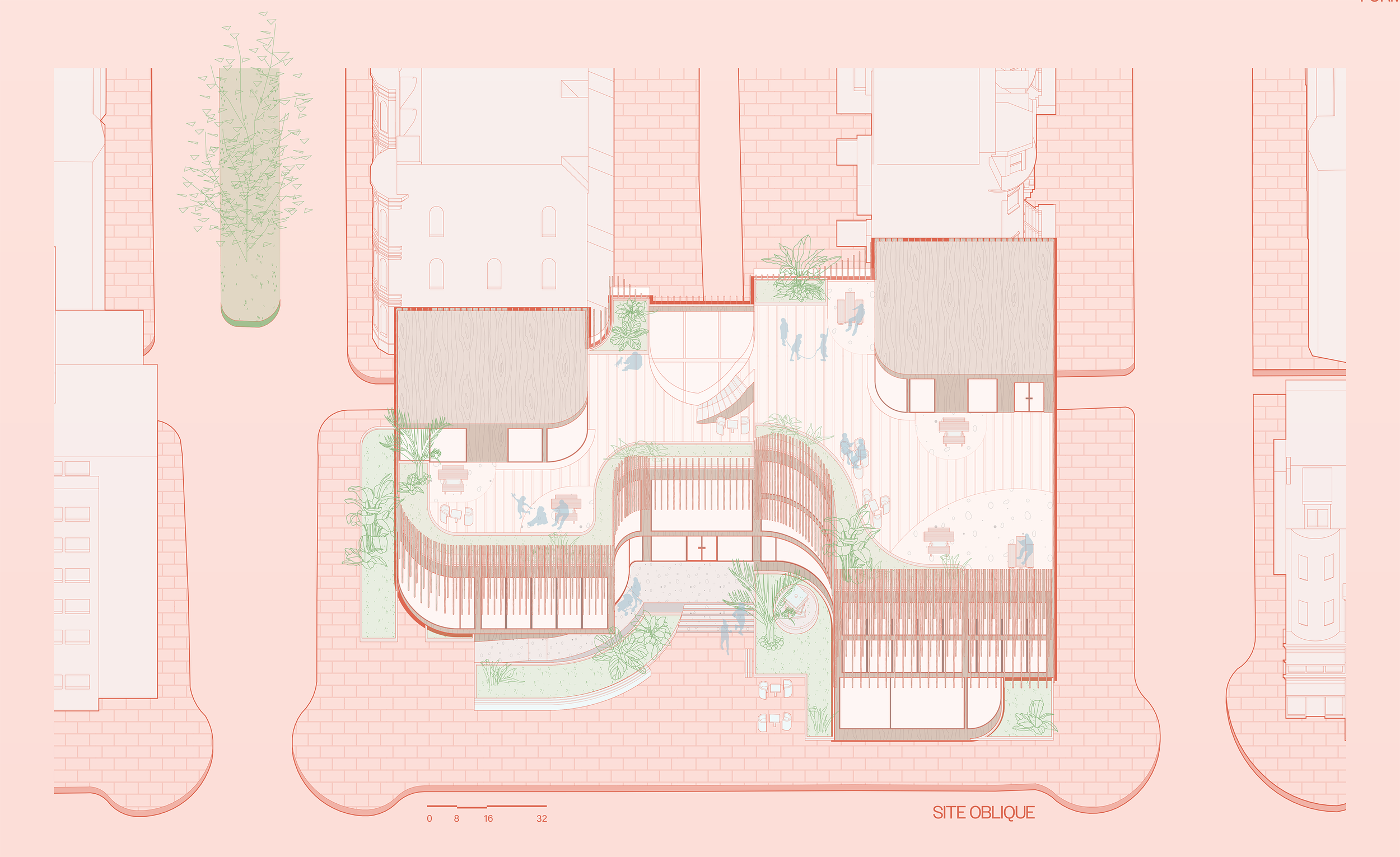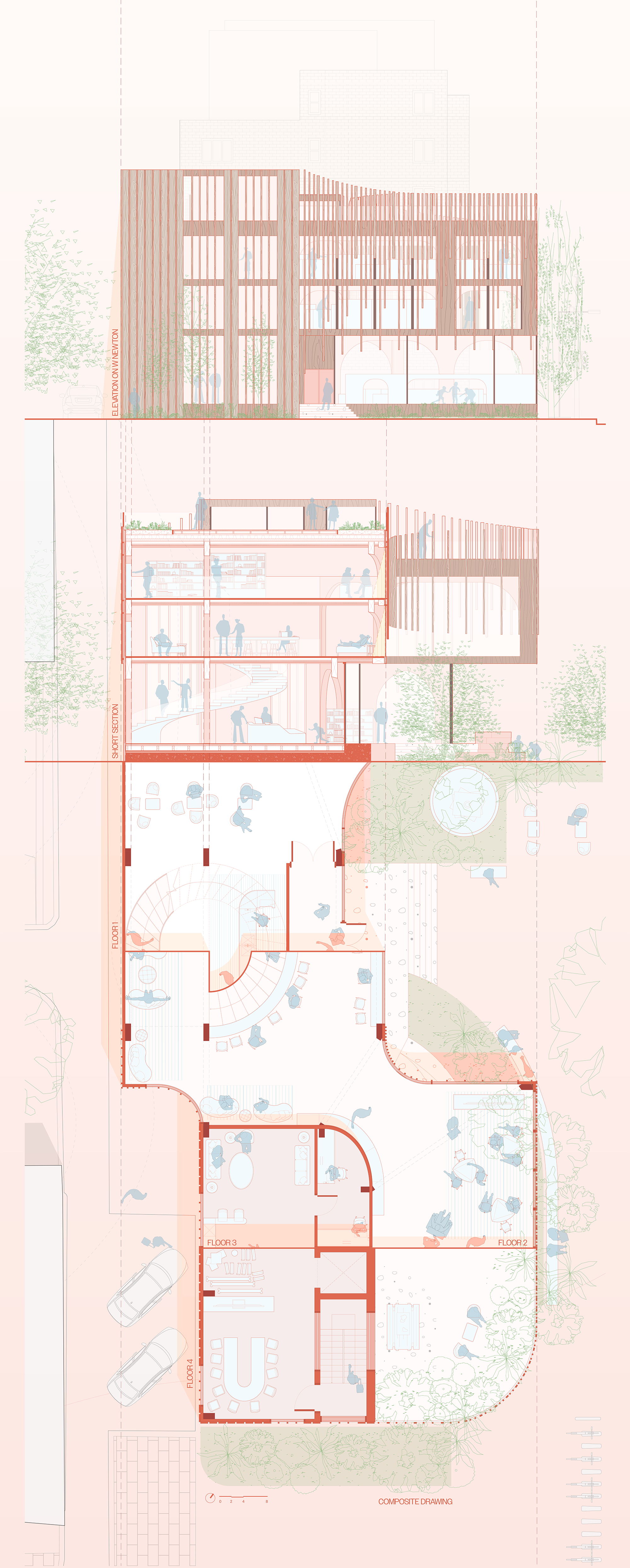 The Tremont St. Library emerges from the massings of nearby buildings, deriving key surrounding volumes to generate spaces that address local needs. The design is structured around two key volumes – a “community node” and a “library node” – that are bridged together by a conceptual “third node,” defined by a central experiential staircase and the main entrance. Half-floor offsets create layered relationships between spaces, allowing for selective visibility and privacy across different programs.