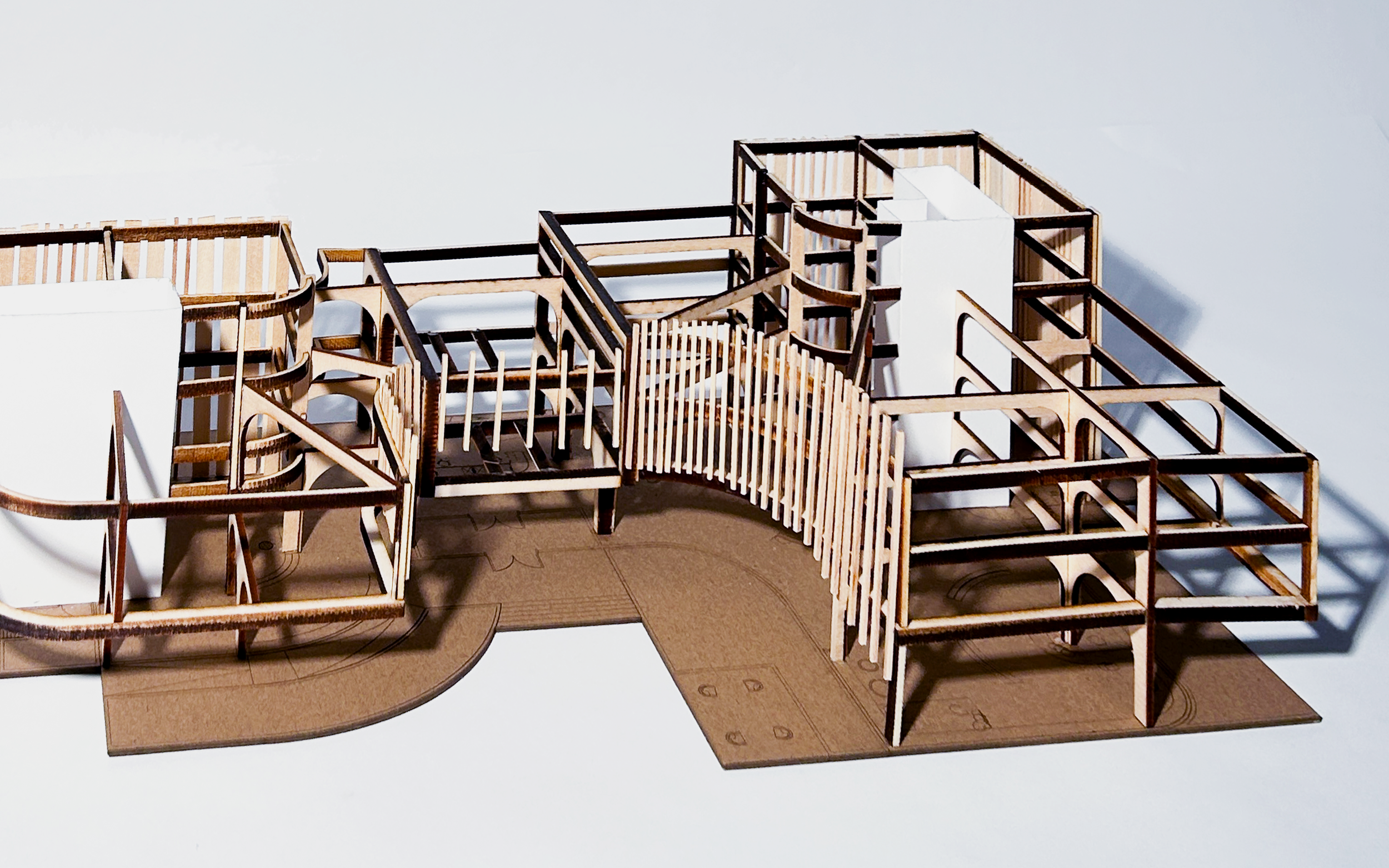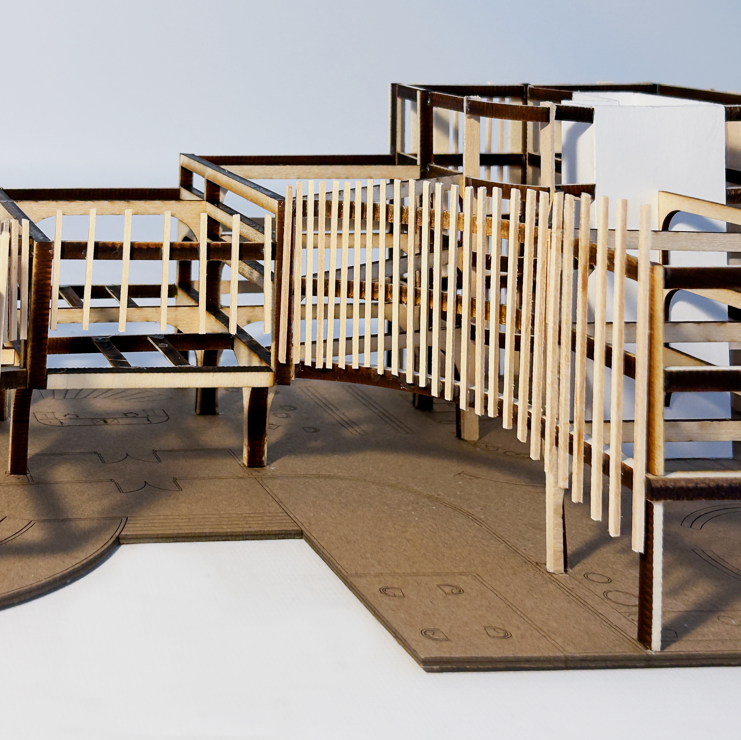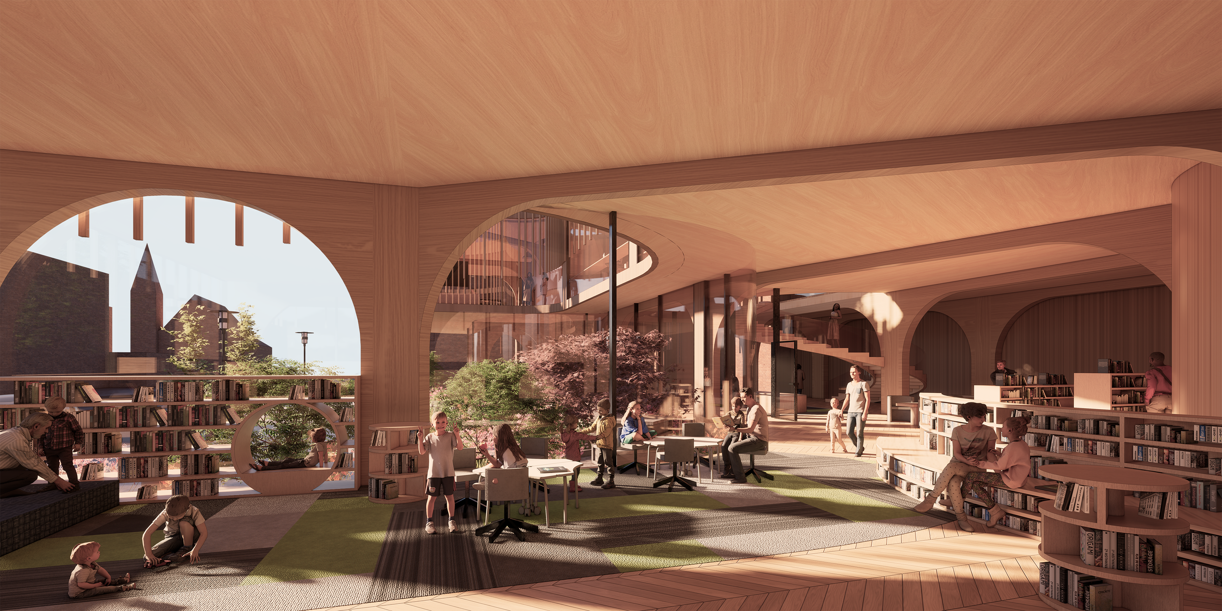 The wooden slatted facade responds to solar irradiation values – wider distance where less shading is needed – and degree of privacy inside the building programs. These slats rise above the facade, forming rooftop railings. Above, the green roof and terrace offer alternative public spaces and an alternative vantage experience to the neighbourhood, functioning as multifunctional spaces that extend the public realm and weave the library more deeply into its community.