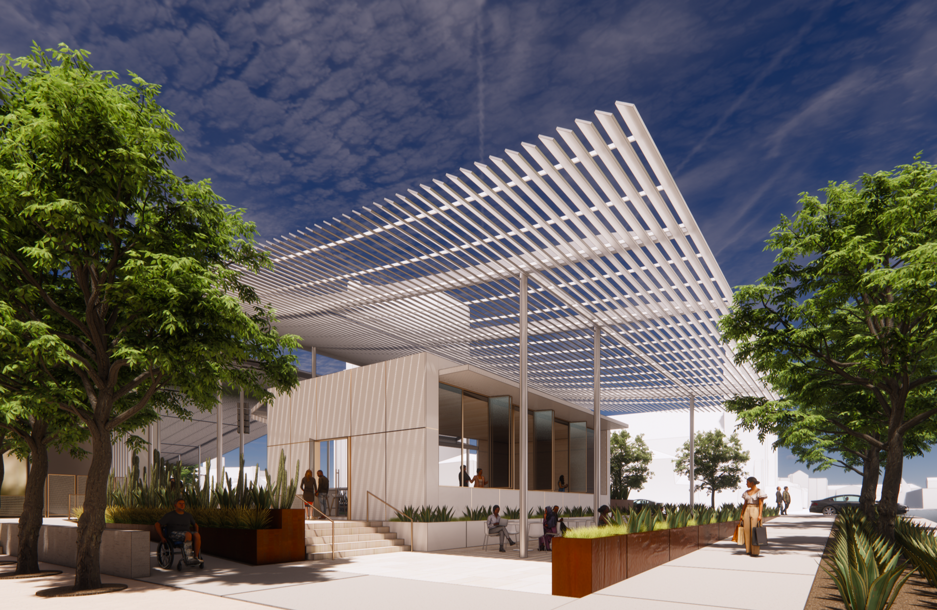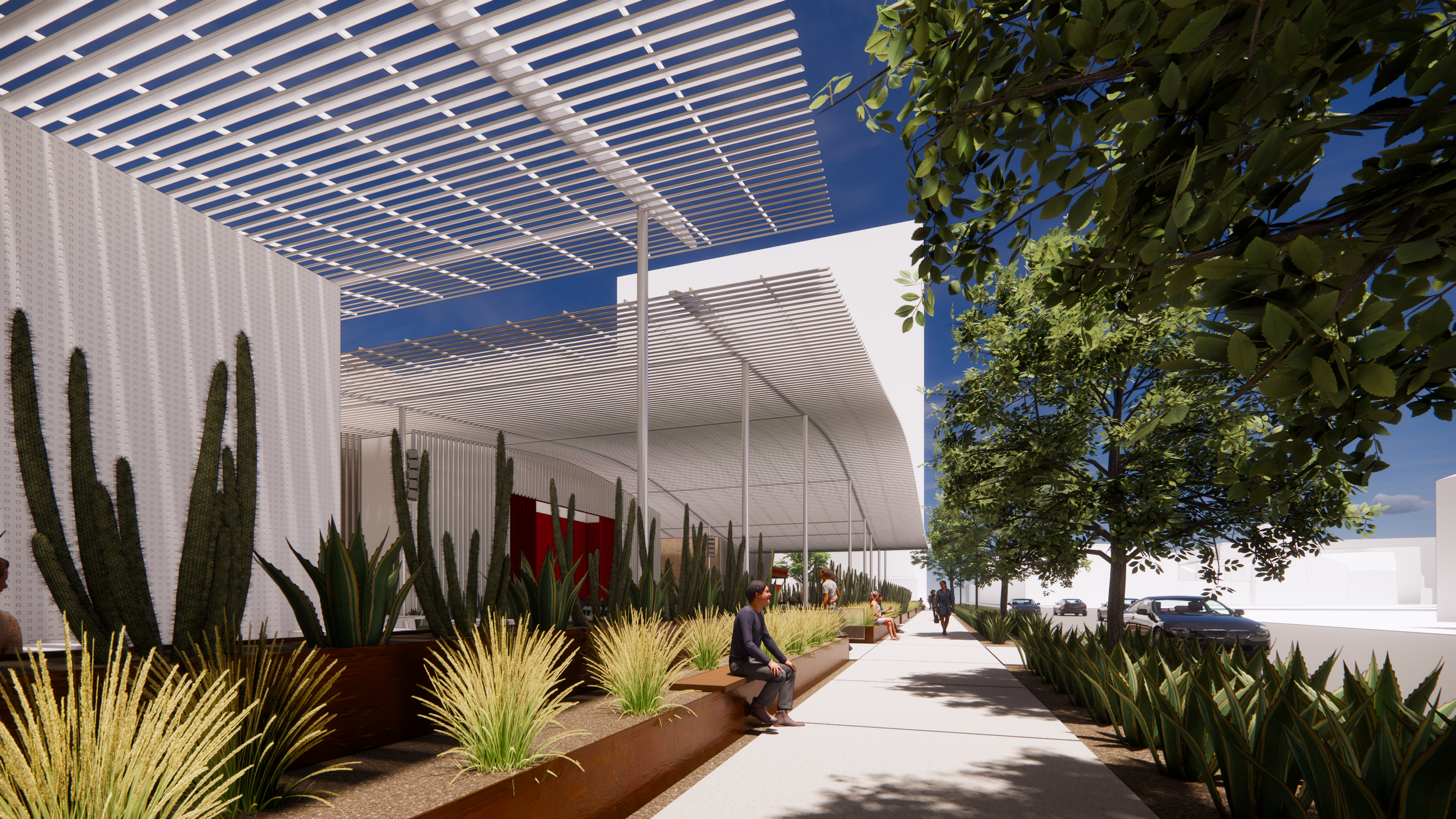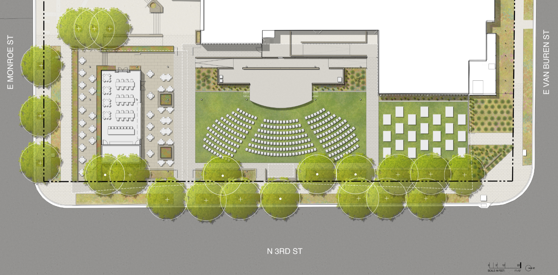 The Herberger Theatre Pavilion in downtown Phoenix, Arizona, is a multipurpose outdoor space. Designed for outdoor music shows, the pavilion is intended to be a welcoming space for everyone during off times. A cafe on the southern side of the lot serves both show attendees and regulars. The north side opens up to the Arizona Centre, attracting customers to a pristine pavilion.