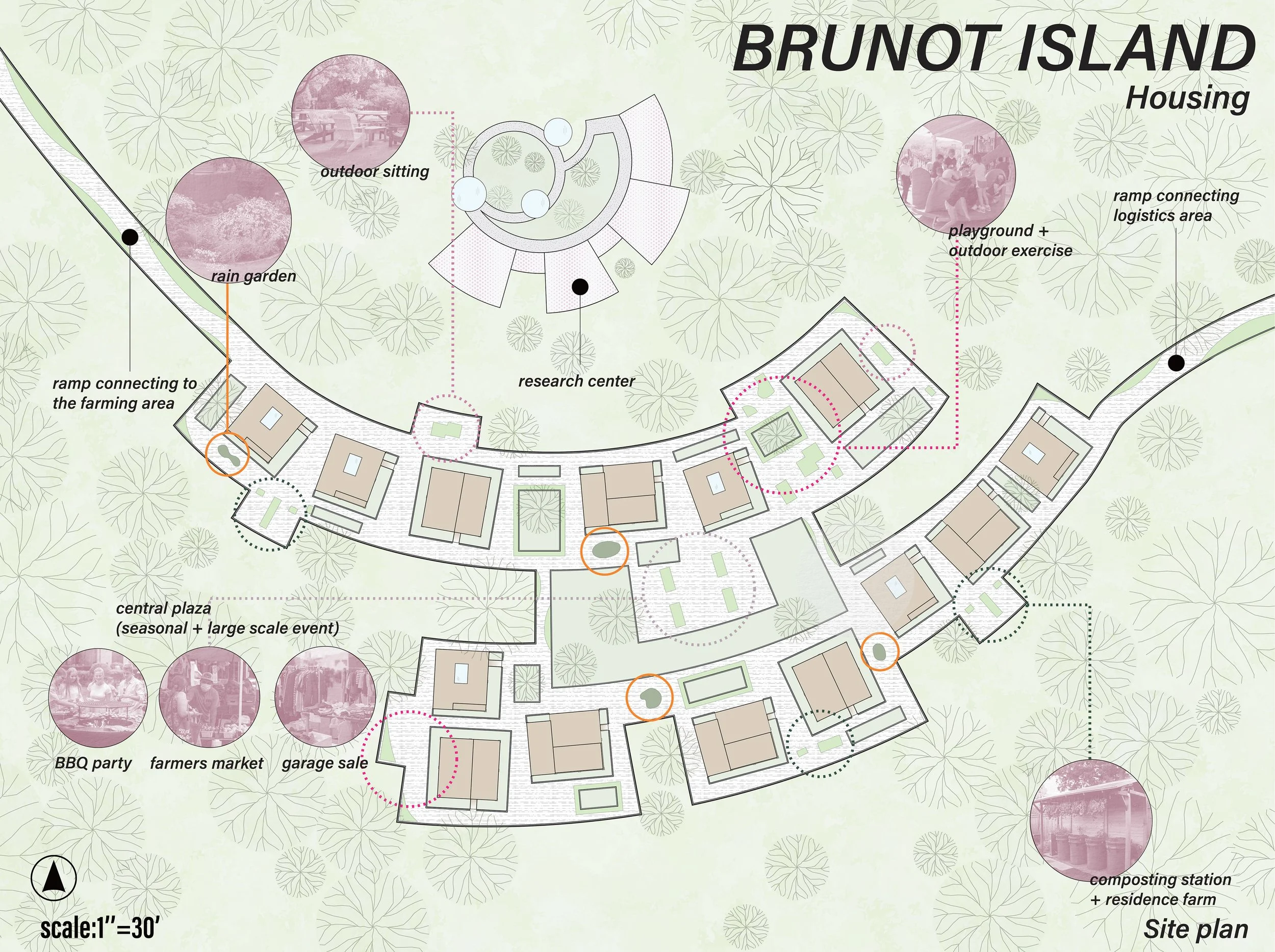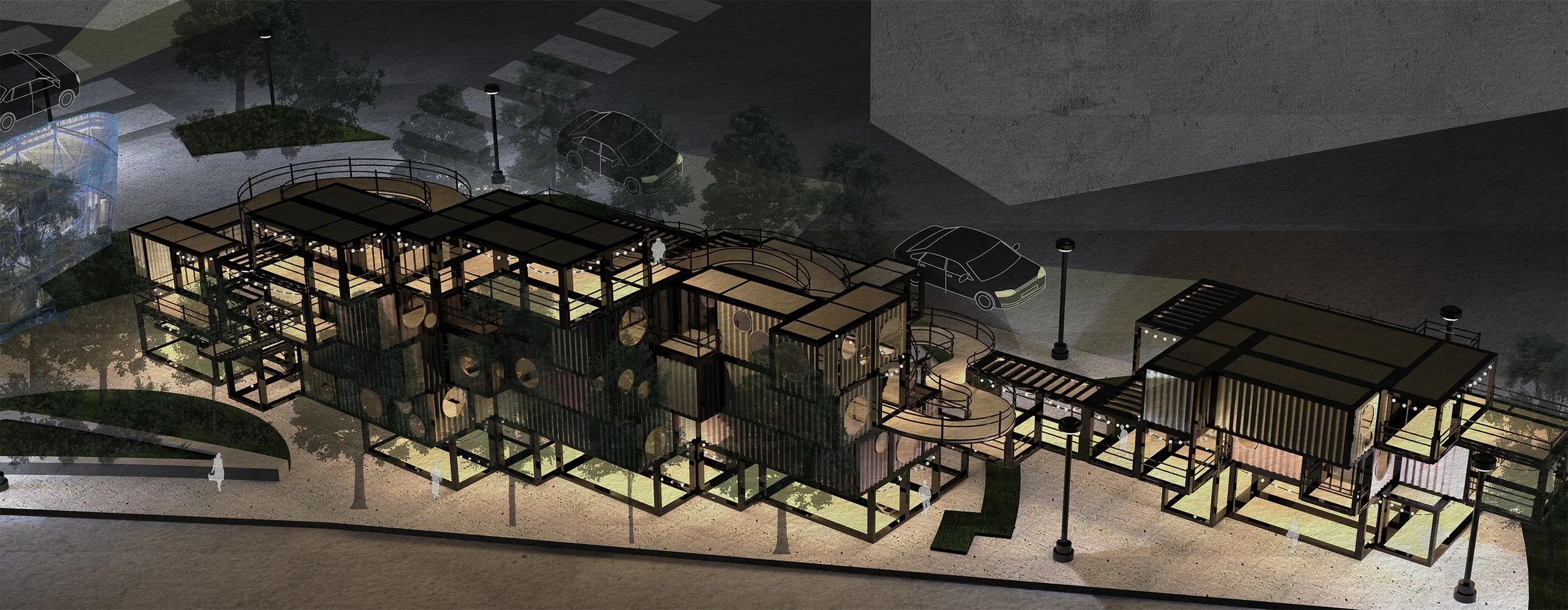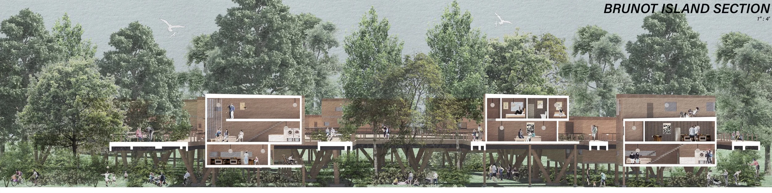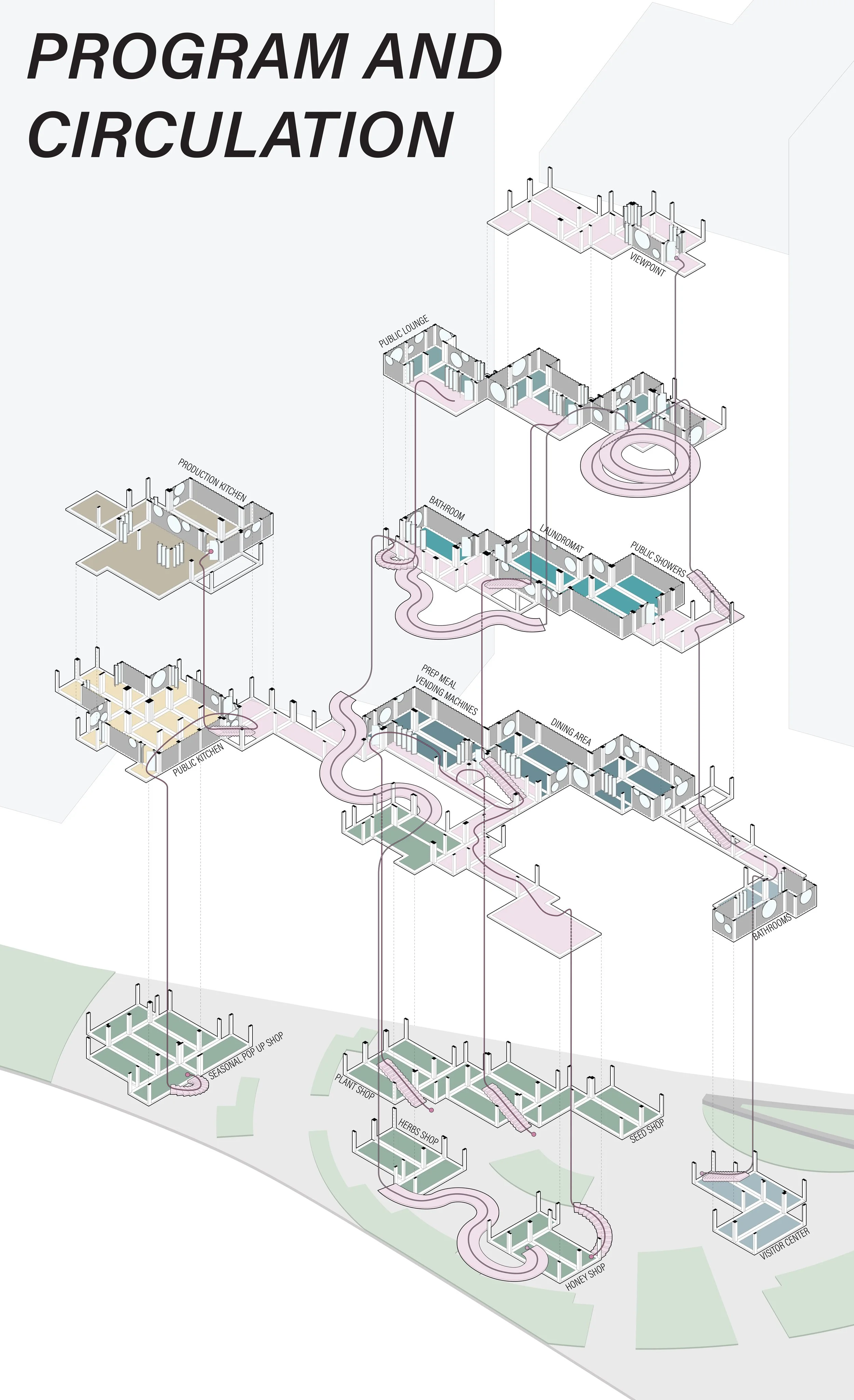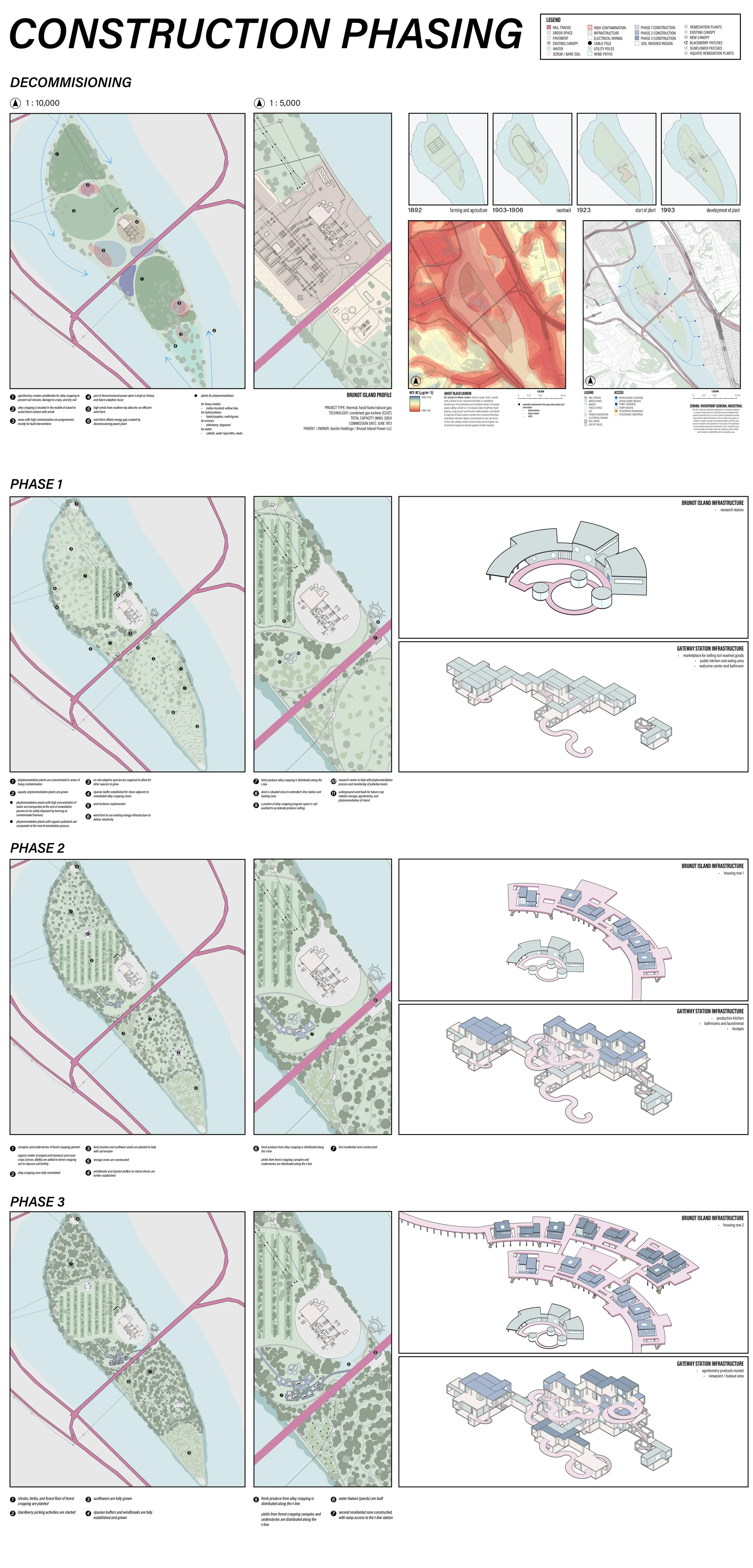 On Brunot Island, the existing natural gas power plant will be remediated and transformed into an agricultural zone. A newly added rail station will streamline the transport of fresh produce grown on the island directly to local neighborhoods via grocery stands, constructed with reused shipping containers.