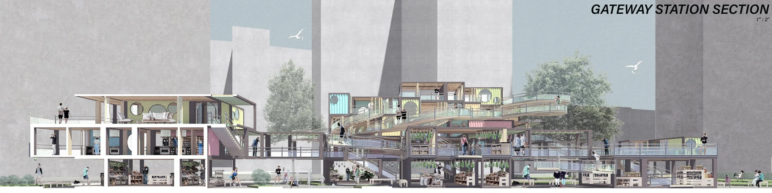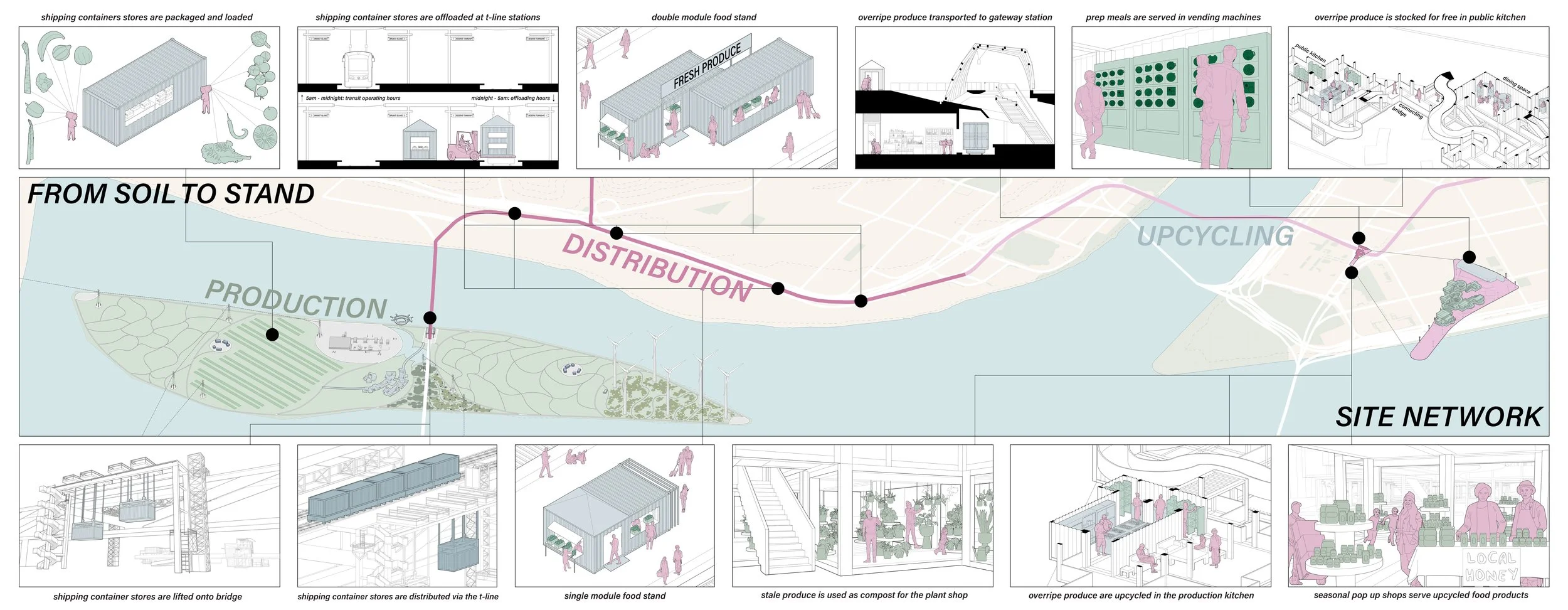 Empty grocery stands are replaced with restocked units and transported to Gateway Station for waste management. Located at the city’s transit crossroads, the station serves as a food upcycling, education, and market center. Surplus and stale produce are distributed to public kitchens, transformed into ready-to-eat meals, preserved through pickling and freeze-drying, or composted for urban planters, creating a sustainable food cycle in Pittsburgh.